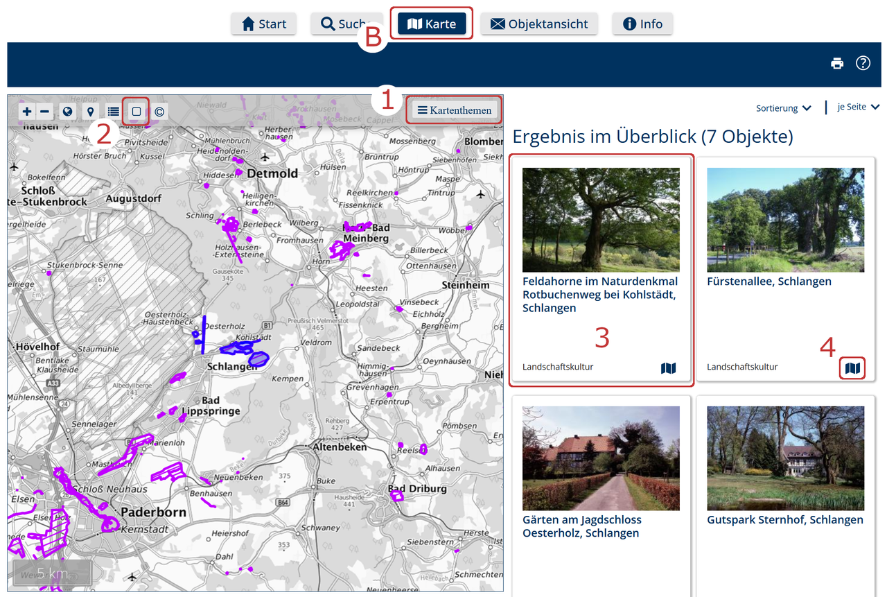 - direkt in der Kartenansicht anzeigen lassen (2: Button „Zeigt das Objekt in der Karte“)